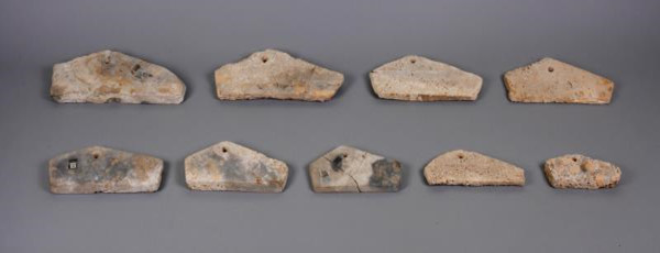 我们来看,这里展示的是出土于虢太子墓的石编磬,共有九件,均素面无纹,形制接近,大小依次递减。为石灰岩质地,器身侵蚀严重,呈灰白色。