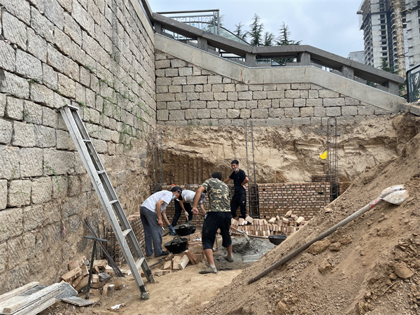 暴雨过后,虢国博物馆紧急成立应急领导小组,召开安全工作会议,组织景区各部门迅速开展抢修排查活动,重点对文物库房、墓地遗址保护区进行现场查看。经查看,馆库藏文物未受影响,但连日暴雨造成景区台阶地基处积水严重且遗址保护区北部约20米挡土墙墙体变形开裂,管道地沟地基沉陷严重,存在严重安全隐患。我们第一时间向有关部门上报受损情况,申请紧急修复,并组织职工对景区道路、供排水、供电、通信系统等重要点位和旅游设施进行拉网式隐患排查,及时清淤排阻,维修受损设施。