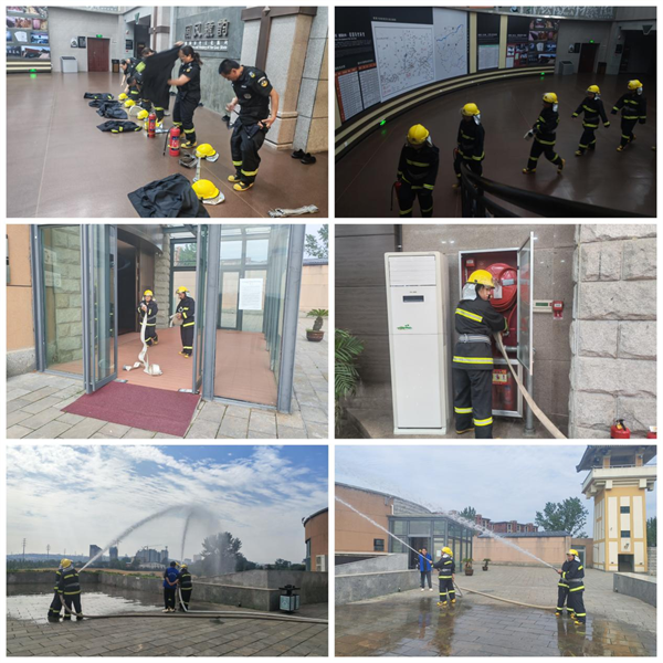 模拟博物馆园区发生火灾的场景,组织微型消防站人员进行灭火演练。微型消防站队员快速着装出动,利用就近灭火器材及消火栓进行初期火灾扑救。
