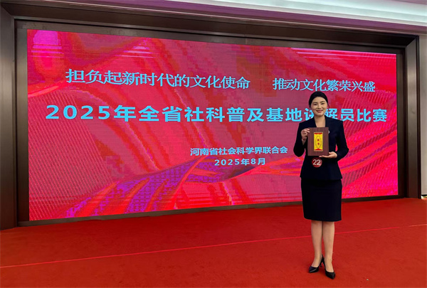 在刚刚落幕的2025年河南省社科普及基地讲解员大赛上,我馆讲解员赵琳莹凭借卓越表现,获得大赛一等奖!这是我馆社科普及人才培养工作的又一硕果。