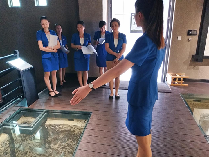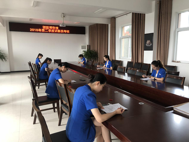 日常阵地考核从5月初开始,一直持续到六月底。社教部负责人通过讲解员日常游客接待讲解,对讲解员的综合素质进行考核评分。6月21日上午,社教部全体讲解员分别在会议室和展厅进行了笔试考核和现场讲解考核。