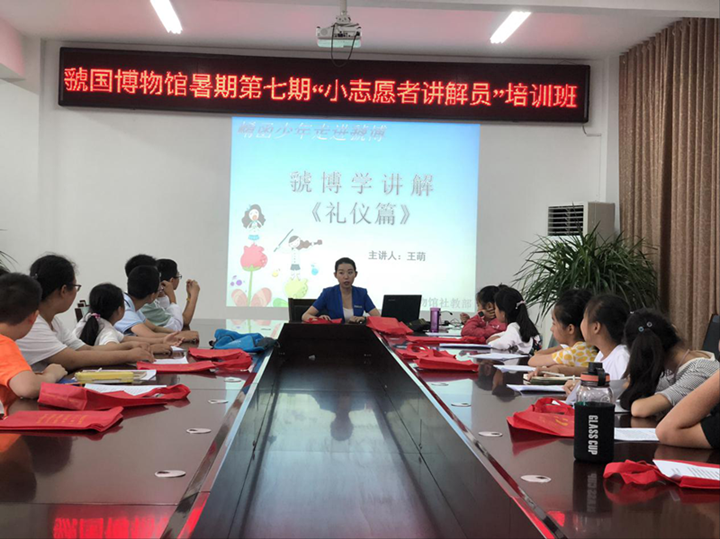 在7月9日当天,为了使小志愿者讲解员们更好地了解和认识讲解工作,虢国博物馆社教部的讲解员老师在开班仪式结束之后,带领小志愿者讲解员参观了《周风虢韵——虢国历史文化陈列展》;并且通过课件学习和随堂互动的形式,向小志愿者讲解员们介绍了“讲解礼仪”和“讲解语言”的重要性。