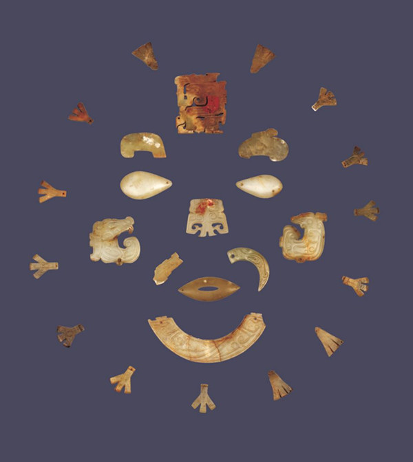 面孔的外侧由14件三叉形薄玉片环绕一周,酷似人的面部轮廓。每件玉片下端有短榫,榫上有小穿孔。后经考古专家推测,这些玉片都是由丝线联缀于丝织物上倒覆在墓主人的脸上,形成一副形神兼备玉面具,被人们称为玉覆面,也叫缀玉瞑目。