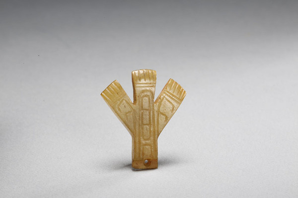 最突出的是它的额头,由一件龙纹玉佩代替,玉质细腻、微微透明,正反两面纹样相同,龙曲体回首,鬃毛上扬,臣字眼,口微张,上唇翻卷,下唇内勾形成一镂空圆孔;龙身下有一凤首,尖喙下勾,眼睛圆瞪。整个五官,搭配巧妙,栩栩如生。