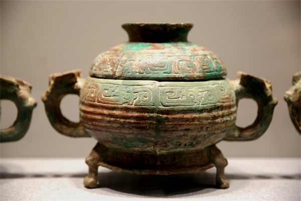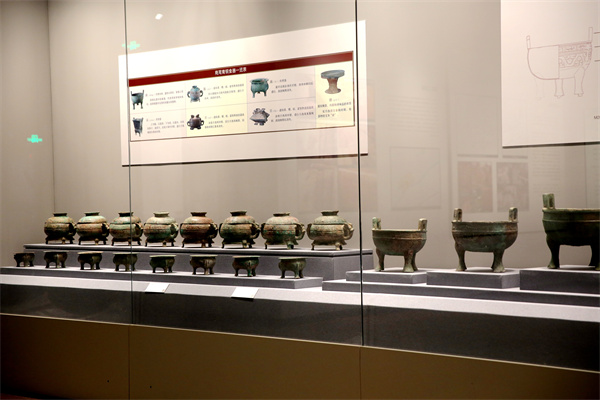 第二部分“吉金永昌”,以青铜礼器展示虢国政治制度。虢国青铜器是虢国文明的象征,在祭祀、战争、宴飨等重大活动中被大量使用。虢国墓地不仅出土有威严庄重的庙堂彝器,而且还有纷繁多样的兵器、车马器和生产工具等,数量众多,纹饰精美,带铭器物多,且制作精细,反映了虢国的宗法、等级等政治制度,生产力发展水平以及文化上的高度成就。
