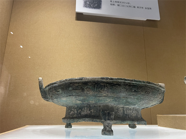 是盛水器,作用是行盥礼时用来盛接洗手后的污水。我们现在看到的是:虢姜盘,它通高17. 4厘米、口径41. 8厘米、腹深5.9厘米。敞口、平方唇、浅腹、两边有耳、圈足较高、下有三个矮支足。匜是注水器,作用是行沃盥之礼时注入净水供洗手用。匜形似葫芦瓢、直口、窄槽流、直腹、龙形鋬、底部有四扁足。