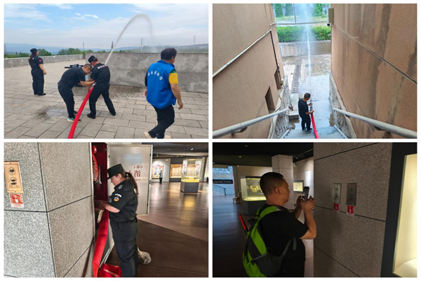 模拟博物馆园区发生火灾的场景,组织微型消防站人员进行灭火演练。微型消防站队员快速着装出动,利用就近灭火器材及消火栓进行初期火灾扑救。