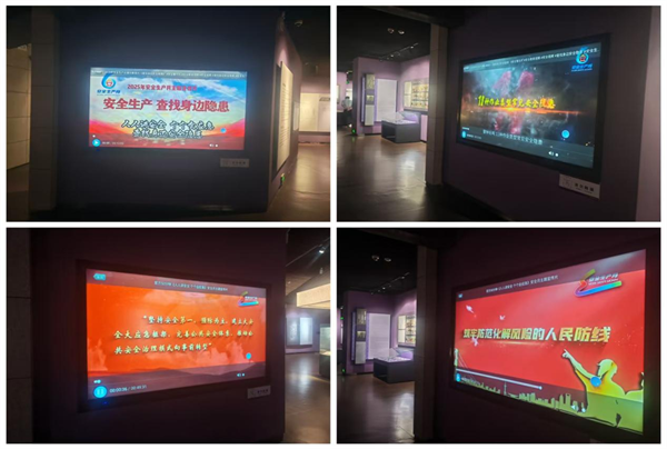 利用LED屏、展厅电子屏等播放安全用火用电等消防提示, 高频次滚动播放2025年“安全生产月”主题宣传海报、消防安全警示片、防汛避险指南、应急疏散逃生知识动画、用电安全提示、文物库房防火要点等。宣传内容图文并茂、通俗易懂,兼具警示性与科普性;面向全体工作人员及公众,持续传递安全理念与知识,营造了“安全无小事,责任重于山”的浓厚文化氛围。