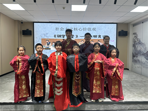 参观结束后,一场精彩的《虢学讲堂》——汉服文化课程正式拉开帷幕。“中国有礼仪之大,故称夏;有服章之美,谓之华。”老师以这句古语开篇,瞬间将孩子们的注意力吸引到了汉服文化之上。课堂上,老师详细讲述了从远古到现代的服饰演变历程,从商周时期的庄重古朴,到秦汉时期的大气雄浑,再到唐宋时期的飘逸灵动,每一个时代的服饰都有着独特的风格与内涵。孩子们听得津津有味,不时发出阵阵惊叹,深深感叹于中华服饰文化的博大精深。