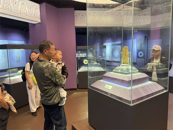 馆内的珍贵藏品成为当之无愧的"流量担当"。镇馆之宝"人龙纹玉璋"前围满了驻足观赏的游客,这块由和田青玉雕琢而成的礼器,上面的人龙纹饰细腻流畅,仿佛诉说着西周礼制的威严与神秘。而"六璜联珠组玉佩"在灯光下流转的温润光泽,更让人体会到古人的审美智慧。