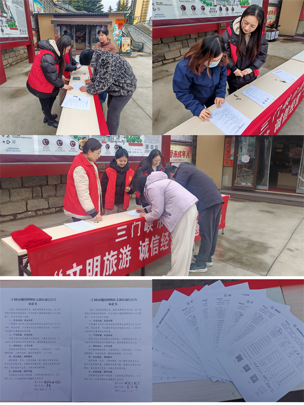 诚信经营,文明旅游。3·15国际消费者权益日当天,我馆积极开展“文明旅游 诚信经营”主题宣传活动。组织馆内商户签订《诚信经营承诺书》,强化商户诚信自律意识;面向游客发放观众意见调查表,征集游客意见;在馆内宣传栏公布服务承诺,主动接受游客监督;组织志愿者在节假日前往馆入口向市民及外地游客宣传《中国公民国内旅游文明行为公约》、《三门峡市文明行为促进条例》等各类文明旅游宣传,协助日常导览,引导游客参观,并提供志愿讲解服务。